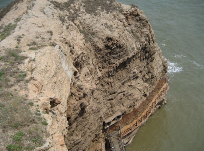 這里是被稱為膠東一絕的田橫棧道。棧道全長220米,高2米,離崖壁地面20米,東起回仙洞,西抵老虎洞。