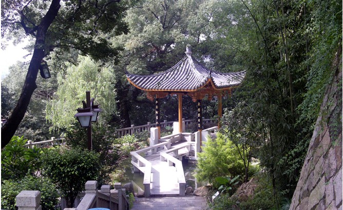 從山的東南麓烏山路拾級登山,行數十步,就到天香臺。向西折,為沖天臺,是36奇景之一。在后壁鐫刻楷書"古放鶴亭"4字。臺旁還有宋程師孟的篆書石刻"沖天臺"3字。"沖天臺"畔有兩方夾峙的大巖石,巖頂橫著一塊天然條巖,這就是"天臺橋"。此橋奇險,據說只有"肯舍身"的人,才能登得上去。