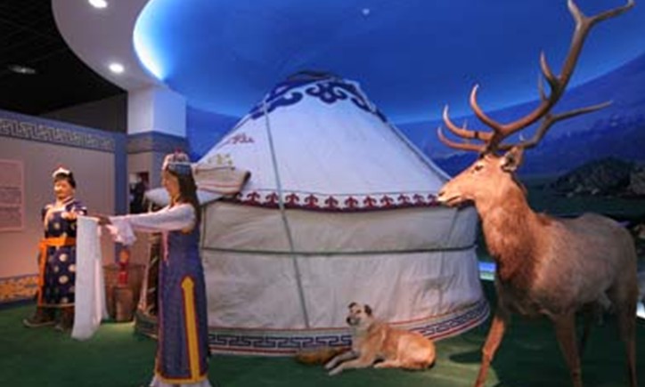 進入此展廳的同時觀眾就會被新疆獨具特色的民居風(fēng)格和色彩絢爛的民族特色所吸引。在以維吾爾民居為主的中央主展廳,還配置了三個各具特色的哈薩克族,柯爾克孜族以及蒙古族的氈房,各種動物標本,猶如進入了一個遼闊的草原,時刻準備與游牧民族高歌,與游牧民族同飲的感覺油然而生。