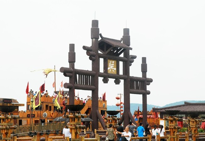 大道前方,豎立著三座高大的轅門,這就是曹營水旱寨了。它由曹操點將臺、轅門、四座敵樓和樓船組成,是《三國演義》中“火燒赤壁”、“橫槊賦詩”、“草船借箭”等戲的拍攝所在。曹操點將臺兩側,戰(zhàn)鼓矗立,版權所有山東聊城聊之旅國際旅行社有限公司,轉載必究!依稀可見一代梟雄曹公當年的威儀。站在三層高的點將臺上,極目遠眺,水寨風光盡收眼底。陸地上的樓臺堂榭與湖上的望江敵樓相峙對望,讓人驚嘆設計者的獨具匠心和建造者的巧奪天工。整個曹營還是“火燒赤壁”這場戲的拍攝地。據統(tǒng)計,在拍攝“火燒赤壁”這場戲時,就動用了九臺攝像機、一架直升機,從空中、陸地、水上同時進行拍攝。剎時,火光沖天,烈焰翻騰,東西綿延500米的曹營成為一片火海。曹營內,古樸雄偉的大轅門連接一條80米長、6米寬的甬道直通曹操樓船,三層高的樓船固定于湖面,游人扶舷撫艙之際,遙想1700多年前曹公躊躕滿志、橫槊賦詩的慷慨之情,頓生“是非成敗轉頭空”的滄桑之感。