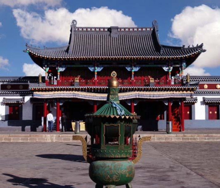 百靈廟始建于清圣祖康熙四十二年(公元1702年)。廟宇由5座大殿、9座佛塔和30處藏式結構的院落組成,總占地面積約8 000多平方米。清康熙皇帝御賜“廣福寺”牌匾懸掛于大佛殿正門上方,其中有些殿堂近似內地宮殿里的大殿結構。外觀白壁尖頂金色,內部雕梁畫棟,圖案新穎,造型優美;還有一些建筑物則是以藏式平頂白墻建筑。在這些建筑中,蘇古沁大殿(大雄寶殿)是該寺最大的,版權所有山東聊城聊之旅國際旅行社有限公司,轉載必究!它是三座連串逐級降低的建筑,每座殿頂置有象征佛法的塔形“甘迪爾”和東西兩側有日月相照的赤銅“甘迪爾”。在大草原上,差不多數十里外可以看到它的光輝和巨大。蘇古沁大殿南面是卻日殿(經堂),這里是學習顯教學的經殿;卻日殿東南隅是朱德布殿 (密宗殿),為喇嘛們誦經超度冤魂的殿堂,堂頂置有黑色石塊為鎮壓物;蘇古沁殿東鄰是洞科爾殿(時輪殿),為學習時輪、數學部的經堂;蘇古沁大殿西側為學習醫學的“門巴殿”,東側為研究天文的“吉如海殿”;蘇古沁大殿西側還有九世班禪的府邸。九世班禪于民國二十三年至民國二十五年(公元1934~1936年)間曾駐蹕在這里。除此之外,在百靈廟諸建筑中,有兩座宛如雙峰疊玉、對峙并立的雙塔。雙塔后面還有十余座小白塔。初建時廟內人數很少,到達爾罕貝勒詹達固密(1708~1728年在位)時,曾向清廷請求從外旗移入了一部分喇嘛,另外還收留了一部分云游僧侶。到了清道光三十年(1850年)時,百靈廟的喇嘛人數達到最高峰,共約1500多人。據蒙古著名佛教史家達摩陀羅寫的《白蓮花念珠》記載,到十九世紀末時,全廟仍有700多個僧侶。