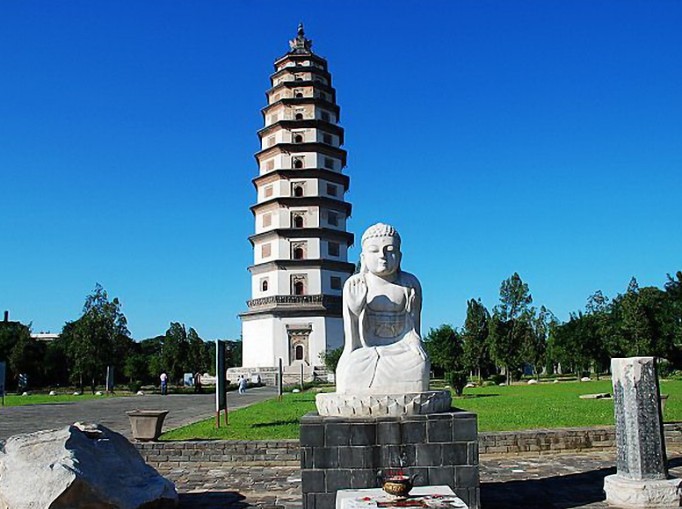 這座八角十三級密檐式磚塔,高80.22米,塔基底徑48.6米,塔體直徑34米,在現(xiàn)存遼塔中雄居魁首。據(jù)元一統(tǒng)志載可能建于遼重熙四年(公元1036年)。塔身赤面有兩行蒙文,內(nèi)容是:“大清咸豐甲寅年敬修”,為清代補(bǔ)修所寫。