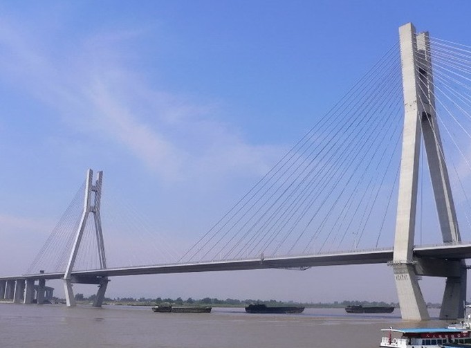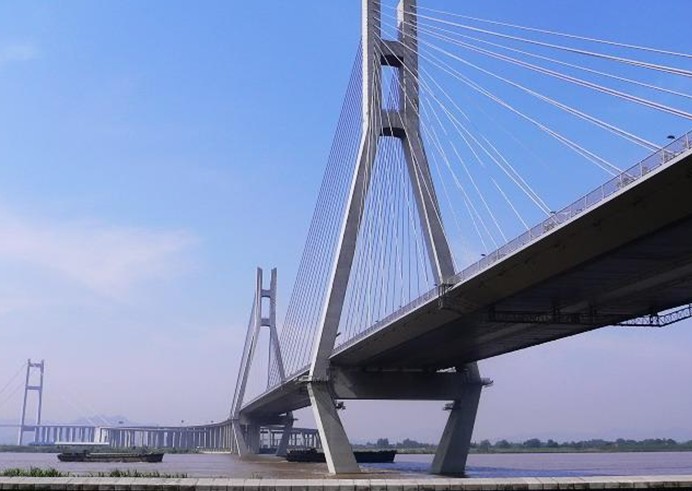 位于江蘇省鎮江、揚州兩市西側,為目前我國第一大跨徑的組合型橋梁,其建設過程中攻克多項世界性技術難題,當時是國內工程規模最大、建設標準最高、投資最大、技術最復雜、技術含量最高的現代化特大型橋梁工程,是我國第一座剛柔相濟的組合型橋梁。