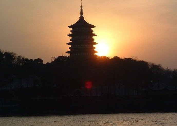 夕照雷峰霞滿天,天光云影碧水漣, 漣漪拍岸輕舟過,古塔輝煌萬人瞻。