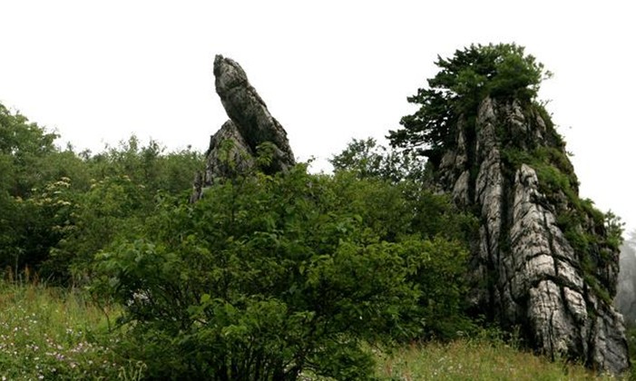 板壁巖恰可以與人生的一個(gè)階段的際遇重合,它從簡單平淡的敘述開始,一片小的漫坡,立著稀疏零散或密集成組的石峰,此處一如既往地與俗世間人的想象作對(duì),拔地而起的巨石,卻禿了頂端,且在頂上生了一層綠。那些錯(cuò)落的石峰,又是鋒芒畢露,惟石峰的尖,卻斜生著,循著植被傾斜的方向指往天空,這就是構(gòu)成了一個(gè)集體的氣勢(shì)。那石,是分層的,斜向?qū)訉拥姆e高,它是地球的大書,記錄著十?dāng)?shù)億年神農(nóng)架構(gòu)成的秘密。也是這樣的石相,讓人叫成了板壁巖。