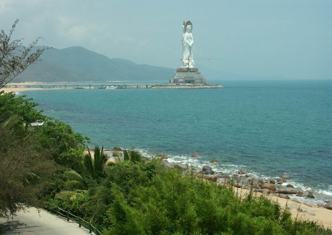 1993年中國國務(wù)院宗教局和海南人民政府批準興建南山寺,并在寺前的海中塑108米高之觀音圣像。此像由海南三亞南海海上觀音功德基金會發(fā)心敬建,三尊化一體,巍峨壯觀,實乃世界造像之最。敬造工程因其規(guī)模宏偉、意義殊勝、佛理底蘊豐富,被譽為“世界級、世紀級”的佛事工程。中國佛教協(xié)會趙樸初會長欣然為圣像題名——“南海海上觀音”。