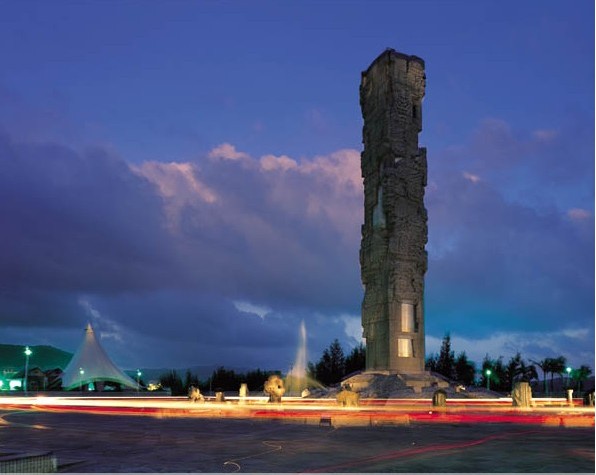圍繞圖騰柱的中心雕塑區(qū),形成三圈石硨,氣勢(shì)宏大、形象獨(dú)特。第一圈有蒼龍、白虎、朱雀、玄武四季標(biāo)識(shí)與日晷24節(jié)氣雕塑;第二圈表現(xiàn)盤古開天地、女媧補(bǔ)天、嫦娥奔月、弄天舞干戚、大禹治水、牛郎織女、后羿射日、夸父追日等八個(gè)遠(yuǎn)古神話;第三圈是反映天文、人、動(dòng)物、植物萬物生靈雕刻。圖騰柱和雕塑群渾然一體,構(gòu)成強(qiáng)烈的中國(guó)古天文意識(shí)和東方神秘色彩。廣場(chǎng)外圍設(shè)計(jì)的五組白色風(fēng)帆式的尖頂帳篷及大型彩色噴泉,給具有古老文化意蘊(yùn)的雕塑增添了現(xiàn)代氣息。