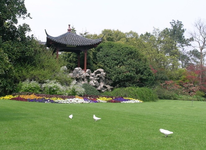 穿過竹院,繞過雪松,前面是一片大草坪。草坪周圍種填了高大挺拔的雪松和濃密常綠的廣玉蘭林帶,使之同周圍的景區(qū)分開,隔離噪聲。這種用植物來分隔空間的處理手法,突破了中國傳統(tǒng)的以墻、籬等建筑劃分空間格局的形式。草坪北臨西里湖,從這里可遠(yuǎn)望蘇堤煙柳、西山層林。運(yùn)用借景手法,突破了有限的園界,伸展了園林景色。草坪西側(cè),種植了一棵紅杉樹,紅杉是美國前總統(tǒng)尼克松于1972年訪華時(shí)贈(zèng)給我國的禮物,周總理決定把紅杉樹苗種在杭州,花港的這一棵,是經(jīng)培育后為紀(jì)念周總理而栽種的。