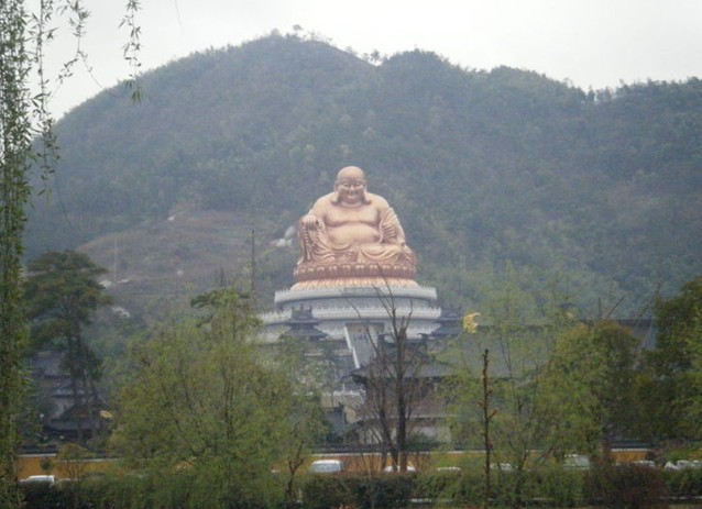 山門內有兩株大樹,名叫銀杏樹,又叫白果樹、公孫樹。這兩株銀杏有雌雄之分,左邊為雌,右邊為雄。更珍貴的是它們系漢代所栽,人稱“漢代白果”。郭沫若游雪竇寺時曾說:“漢代大樹,誠不虛也!”雄樹旁有一石碑,上書“彌勒應跡勝地”。是指彌勒佛與雪竇寺的淵源深厚。相傳彌勒菩薩化身布袋和尚,在奉化縣江水中現身,被長汀村人收養,后到奉化岳林寺出家,常到雪竇寺講經弘法,因而岳林寺、雪竇寺被人們同稱為“彌勒應跡圣地”,公認為彌勒道場。所以,在雪竇寺的天王殿和大雄寶殿之間,特建有一座“彌勒殿”。