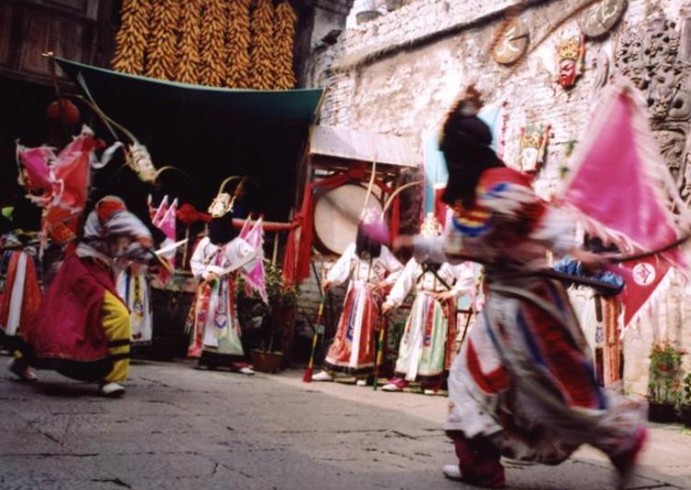 地戲源于明代的軍儺,軍儺這一種軍隊專司的儀典,它是由征南大軍帶入黔中的。屯堡人的祖先跳軍儺不是娛人,更多的成份是娛神,用這一種儺儀作為出征的祭典,振奮軍威,恐嚇敵人。地戲演的全是忠臣義士,演的全是報國殺敵的英雄故事,因此地戲是武戲。地戲最主要的表現形式是唱和舞。版權所有山東聊城聊之旅國際旅行社有限公司,轉載必究!演員頭戴精美的“臉子”,腰圍鮮艷的彩裙,身背戰旗,持戈揚戟,在一鼓一鑼的伴奏下著粗獷、原始、拙樸的跳躍,間雜高亢嘶啞的唱腔,遠古戰爭的場面歷歷在目,演員由人而神,觀者的思緒已飄向歷史的空間。