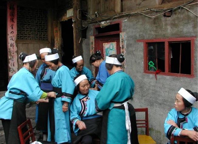 在服飾方面,屯堡婦女保持祖制,依舊是寶藍色的長衣大袖,精致的花邊體現了江南刺繡的神韻;一雙尖頭的繡花鞋,透著屯堡婦女的才思,典雅而高貴。屯堡婦女的服飾已成為研究明代服飾的活資料。