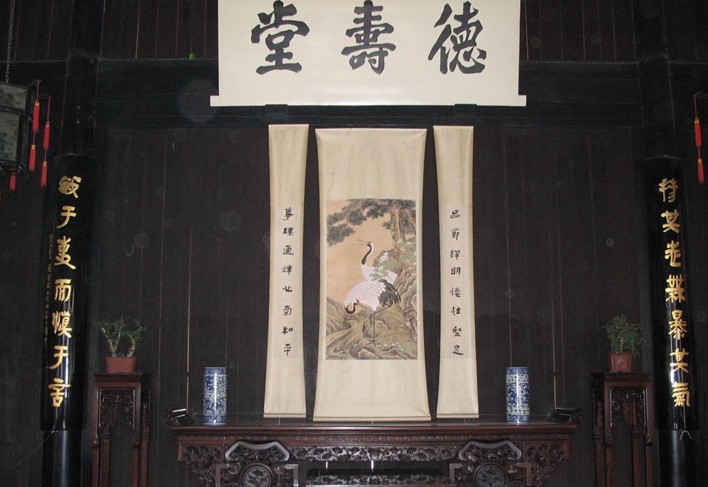 第二進為廳堂,俗稱“大堂前”,是周氏族人的公共活動場所,以作喜慶、祝福和宴會賓客之用。廳堂正上方高懸一塊大匾“德壽堂”,兩旁柱子上有一副紅底黑字的楹聯: