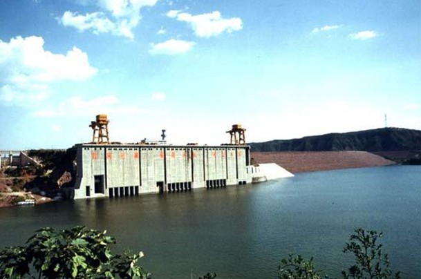 大壩主壩為混凝土重力壩,壩長713.2米,最大壩高106米;副壩為鋼筋混凝土心墻,長144米,最大壩高24米;主、副壩總長857.2米。電站廠房為壩后式,全長223.88米,寬26.2米,可安裝8臺(tái)發(fā)電機(jī)組,現(xiàn)有7臺(tái)機(jī)組,發(fā)電量41萬千瓦,為低水頭徑流發(fā)電。