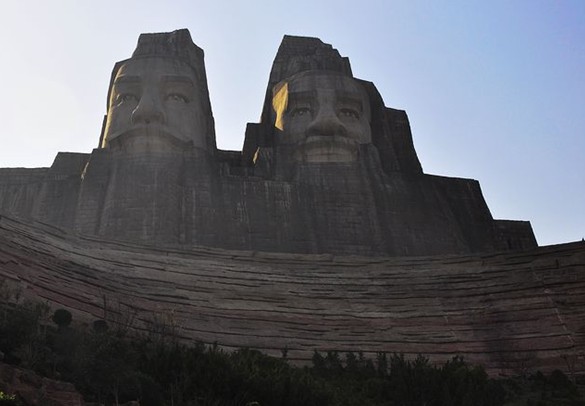 是目前國(guó)內(nèi)最雄偉的雕塑之一。它依山就勢(shì),以山為體,82米高的整座向陽(yáng)山作為像身,再在山頂塑造18米高的頭像,總高達(dá)到100米。構(gòu)思新穎,獨(dú)具匠心,不同凡響。二帝坐南朝北,背依邙山,面對(duì)黃河。巨像前是一個(gè)開(kāi)闊場(chǎng)地,周圍遍植松柏,中間建筑祭壇。祭壇至塑像的軸線上建有長(zhǎng)200米的神道,兩側(cè)各列四座鑄銅大鼎,連同山前一座共九鼎,寓意九州四方江山永固。廣場(chǎng)東西兩端擺放大型編鐘、銅鼓各一個(gè)。