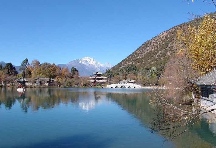 麗江黑龍潭公園俗稱龍王廟,位于麗江古城北端象山之麓。黑龍潭內隨勢錯落的古建筑有龍神祠、得月樓、鎖翠橋、玉皇閣和后來遷建于此的原明代芝山福國寺解脫林門樓、五鳳樓,原知府衙署的明代光碧樓及清代聽鸝榭、一文亭、文明坊等建筑。