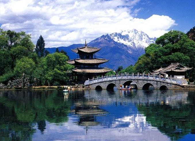 龍潭映雪 以五孔橋、得月樓、雪山及黑龍潭中的雪山倒影組成的影像早已成為麗江的經典風光明信片,也成為游人在麗江拍照最多的取景之一。乍一看照片,沒到過麗江的人可能還會以為遠處的玉龍雪山是黑龍潭的組成部分。黑龍潭經不斷擴建后,今天已成為詩情畫意的山水園林,有南方頤和園之稱。