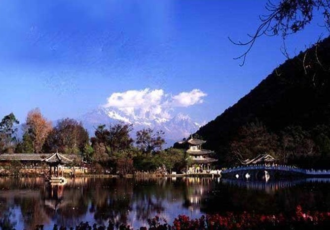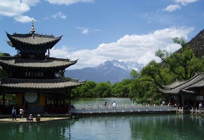 云南麗江黑龍潭:麗江黑龍潭又名玉泉公園,位于城北象山腳下,從古城四方街沿經緯縱橫的玉河溯流而上,約行一公里有一處晶瑩清澈的泉潭,即為中外聞名的黑龍潭。潭水從石縫間涌涌噴出,依山斛清泉匯成四萬平方米潭面。四周山清水秀,柳暗花明。依山傍水造型優美的古建筑點綴其間。其流韻溢彩,常引人駐足留連。
