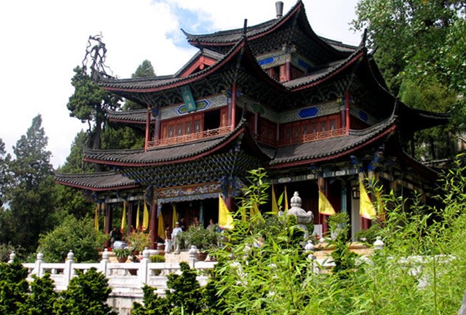 五鳳樓(原名法云間),位于黑龍潭公園北端,始建于明萬歷二十九年(公元1601年),1983年被公布為云南省重點文物保護單位。樓高20米,為層甍三重擔結構,基呈亞字形,樓臺三疊,屋擔八角,三層共24個飛檐,就象五只彩鳳展翅來儀,故名五鳳樓。全樓共有32棵柱子落地,其中四棵中柱各高12米,柱上部分用斗架手法建成,樓尖貼金實頂。天花板上繪有太極圖、飛天神王、龍鳳呈祥等圖案,線條流暢,色彩絢麗,具有漢、藏、納西等民族的建筑藝術風格,是中國古代建筑中稀世珍寶和典型范例。