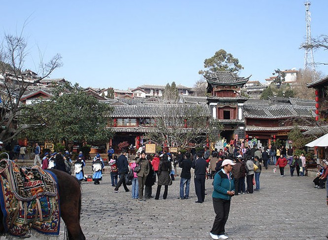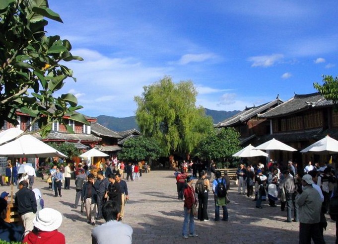 麗江是一個日日夜夜和淙淙流水相約的城市,就像威尼斯那樣。不過大研鎮(zhèn)的水道,是經過設計用人工挖掘的。原始的河流只有一條,就是穿城而過的中河,從中河又人工開發(fā)出西河和東河,分為三支,像一棵大樹的主干和兩個支干。從它們又生出無數的小渠。居民們甚至可以直接飲用這泉水。四方街是一個梯形的小廣場,建造時被設計得中間稍微凸起,兩邊凹下,猶如一片巨瓦。