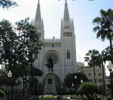 瓜亞基爾城中心是一百年廣場,廣場上高聳著1920年修建的巨大的解放紀(jì)念碑。著名的弗朗西斯科大教堂在廣場不遠的地方,這座建筑氣勢宏偉,裝飾華麗,是瓜亞基爾的建筑珍品。教堂前面有一座風(fēng)景優(yōu)美的公園,在公園樹林深處可觀賞到各種珍貴動物。瓜亞基爾最繁榮的街道是10月9日大道,路旁商店比鱗而立,人群擁擠。大道穿過一百年廣場,通向馬萊孔濱水區(qū),濱水區(qū)沿瓜亞斯河岸鋪開。壯觀典雅的市政廳和政府官就坐落在這一帶。漫步街頭,可看到南美獨立運動的領(lǐng)袖玻利瓦爾和圣馬丁的塑像。1822年7月26日—27日,這兩位民族英雄就在此共商大計,決心把西班牙殖民者全部趕出拉美大陸并爭取南美各國的徹底獨立。這次歷史性的會晤為南美人民贏得了偉大的勝利。