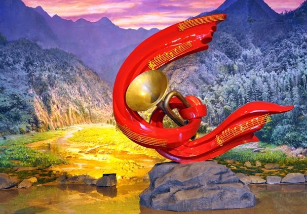 走進新館,映入眼簾的是一個面積600平米,高9米的展覽序廳,最引人注目的是氣勢如虹的主題背景。據悉,背景油畫由清華美院師生集體創作,面積為600平方米,為我國目前最大的油畫。序廳是一個由巨幅油畫、主題圓雕和實體山景組合而成的大型多媒體景觀,主題鮮明,氣勢恢弘。