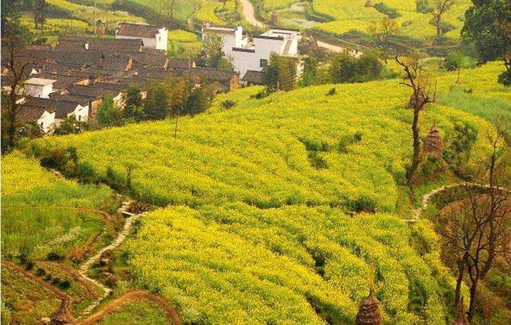 在海拔千米的高山上;梯田如鏈似帶,層層疊疊,高低錯落,壯麗雄奇; 水面映著藍天和古樹; 梯田下面,山窩里藏著一小撮粉墻黛瓦分外溫柔可親。 這是婺源田園風光的代表。從江嶺開始,公路始終在山間盤旋,從江嶺向下看,只見層層梯田,曲折的線條,山谷盆地中的小河,河邊聚集的三、四個村莊,四周圍繞 著青山,構成了一副極美的婺源農村風光畫卷。 作為“中國最美鄉村”中田園風光的代表作“江嶺風光”不僅是世界級攝影基地,更由于古樹、河流、梯田、農舍、農作物合理布局,體現了人與自然的親近、和諧“天人合一”在這里得以完美展示。尤其是山頂人家成了江嶺風光的大背景,遠眺白墻黛瓦掩在黃花綠樹間,陣陣云霧飄來,恍若天上人間。
