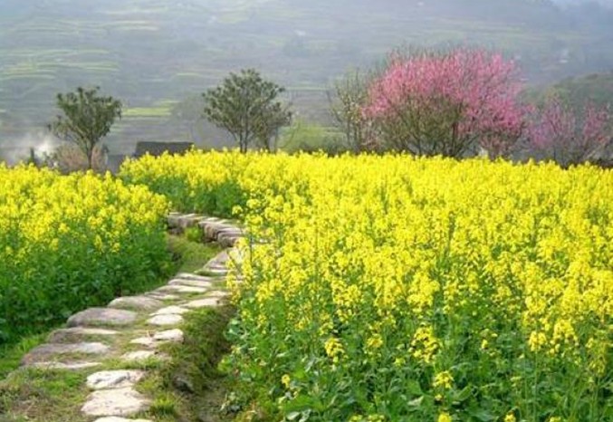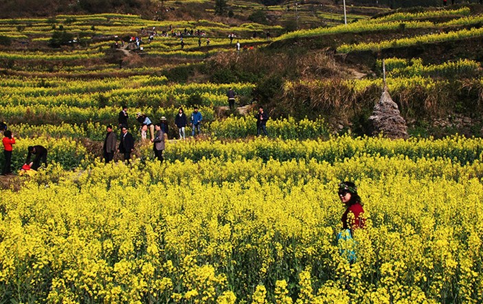 江嶺梯田隨著四季的變幻,景色也各不相同,她好似山里的大妹子,不時在用各種色彩裝飾著自己,有時顯得嫵媚、有時顯得熱烈、有時顯得奔放、有時顯得深沉……春天的江嶺,是一片金黃色油菜花的世界。初春的江嶺,天氣一會兒寒、一會兒暖,一會兒晴、一會兒雨,雖有春的感受,但卻隱約模糊。待到油菜花盛開之時,就是一幅春日融融、春風和煦的景色。層層疊疊的油菜花滿山滿野地盛開著,那菜花黃得質樸、黃得純情、黃得熱烈、黃得坦誠。清早那油菜花的花瓣上還帶著水珠,在春日柔和陽光的映照下,晶瑩中透出嫵媚。而傍晚落日的余暉又為滿嶺的油菜花披上了一層朦朦朧朧蒙的細紗,猶如天上流云,又似一道飄落的晚霞,微風拂過,送來一縷縷淡淡的清香。春天里江嶺梯田這一片油菜花,似一個大山中美麗的少女,她招來了蜜蜂、引來了蝴蝶、也迎來了八方游客。