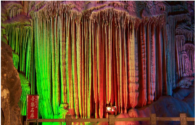 在桂林市西北7千米處的光明山上,因洞口長有蘆荻草,其可制牧笛而命名。蘆笛巖是一個地下溶洞,深230米,長約500米,最短處約90米,其游程雖比七星巖短,但景色卻比七星巖更奇。蘆笛巖內鐘乳石,石筍、石柱、石幔,石花玲瓏多姿,景象萬千,由此所組成的雄偉“宮殿”、高峻“山峰”、擎天“玉柱”、無邊“林海”無不雄奇瑰麗,耀眼奪目,因此蘆笛巖享有“天然藝術宮”之美稱,與七星巖并列為“桂林兩大奇洞”。蘆笛洞內景點有獅嶺朝霞、石乳羅帳、青松翠柏、盤龍寶塔、云臺攬勝、簾外云山、原始森林、琉璃宮燈、遠望山城、幽景留聽等。