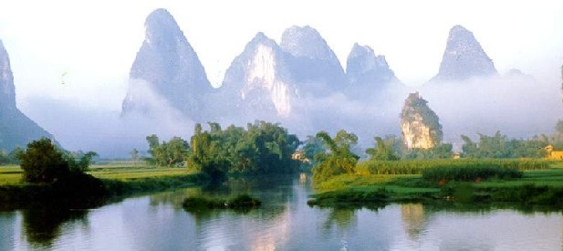 是舉世公認的世界第一流風景勝地。人們到桂林游漓江,主要是從桂林乘船順流而下至陽朔這83千米的水程。這一帶峰巒聳秀,碧水如鏡,青山浮水,倒影翩翩,兩岸景色猶如百里錦繡畫廊。沿途主要景點有象鼻山、穿山、斗雞山、精品上,凈瓶山、磨盤山、冠山 、繡山、 仙人推磨、畫山、黃山倒影、螺螄山、碧連峰,書童山等。這里的景色無比秀美,單是那江里的倒影,就別有一番情趣。那水里的山,比岸上的山更為清晰;而且因為水的流動,山也仿佛流動起來。山的姿態,也隨著船的位置,不斷變化。漓江景色之奇還在山光水色之變化,在清晨,在中午,在黃昏,各有其姿,變化萬千。尤其是在春雨迷蒙的早晨,江面象浮動一層輕紗般的白蒙蒙的雨絲,這時的山水就更具有一種朦朧之美。