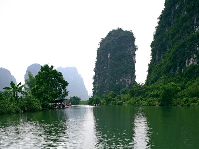 青山腳下,村落點點,炊煙裊裊;遇水之濱,村婦呼朋引伴,浣衣喧鬧,漁翁輕蕩竹筏,撒網(wǎng)捕魚,鴨兒成群結隊;或憩息,或閑游,或嬉戲,煥發(fā)出濃郁的鄉(xiāng)土氣息。河岸兩側,田疇平整開闊,綠意逼人,稻花飄香。置身其間,頓覺心曠神怡,超然物外。這景致,這感覺,在山水甲天下的漓江也是找不到的。不同的季節(jié),不同的天氣,遇龍河有著不同的神韻,春賞煙雨浮畫,夏醉鏡影映霞,秋觀紅葉流火,冬贊綠竹勝花。綠是生命之聲,遇龍生態(tài)就是綠之海、綠之崖、綠的詩、綠的夢;綠海行舟,您會覺得船仿佛航行在綠色的畫卷中,整條遇龍河純情得就猶如一支綠的夢幻曲。