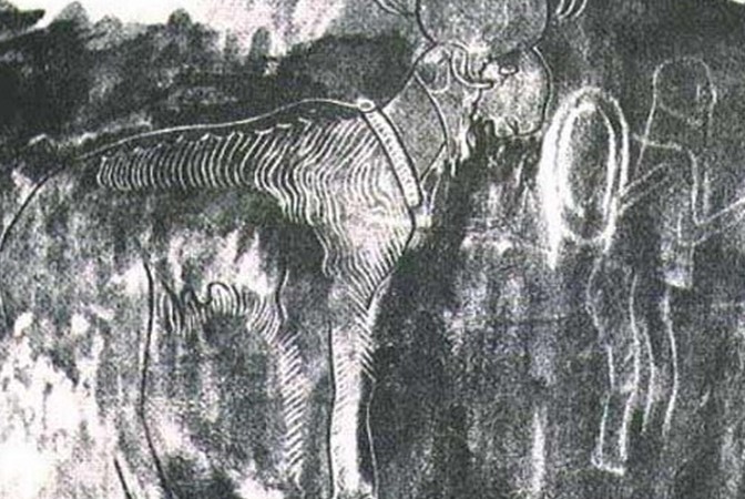 盧山巖畫位于海西州天峻縣江河鄉(xiāng)盧山山丘上,此距江河鄉(xiāng)政府約8公里。山丘位于江河右岸,海拔3800米,相對高度約40米。山丘南部地勢開闊,水草豐美,巖畫散布于山丘,在南山坡上有平面的30多塊花崗閃長粉巖上。單獨的、不相連的有面的巖石,即為一區(qū),共31區(qū)。最大的為第一區(qū),巖畫約30平方米,畫面約20平方米,上面有158個個體形象。最小的巖畫僅數厘米,其畫面僅一動物。畫面描繪的主要內容有動物(主要以牛、馬、鹿、鷹、豹子、狗為主,牛最多,鹿次之)、狩獵、戰(zhàn)爭、生殖及藏文字等