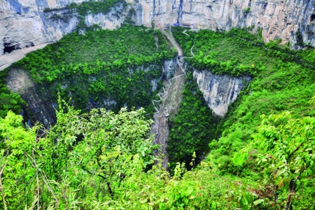 從坑口到坑底有一條蜿蜒曲折的梯道,總長(zhǎng)度2.7公里(2800余步臺(tái)階)地縫是兩座平行山巒間凹下去呈“V”字形的一條大裂縫, 它發(fā)源于奉節(jié)縣長(zhǎng)安鄉(xiāng)火燒二壩,全長(zhǎng)37公里。地縫上段地勢(shì)開闊,林木繁茂,小橋流水;版權(quán)所有山東聊城聊之旅國(guó)際旅行社有限公司,轉(zhuǎn)載必究!中段逼仄如巷,寬處達(dá)70米左右,最窄處僅容一人通行,最深處達(dá)900米,溪水自“黑眼”一帶注入地下暗河,形成干谷;下段是地下峽谷,中外探險(xiǎn)家曾多次深入地縫中探險(xiǎn),專家推測(cè)地縫暗河流向了小寨天坑。