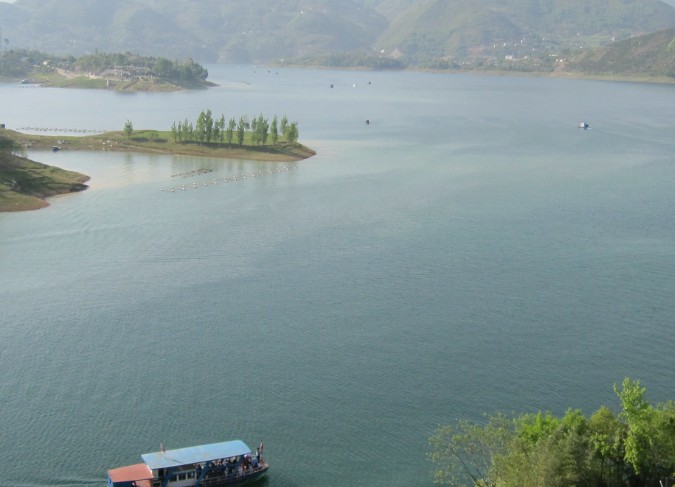 瀛湖,銜秦巴,吞漢江,浩渺煙波,渾無際涯。水面廣闊,湖光瀲滟,迭翠堆玉,島嶼棋布,相映成趣。客來江河千里外,山在水天一色中;朝看彩霞浮湖面,暮觀紅日融浪中,有登泰山觀日出之妙;午間,魚帆點點,白鷺行行,群山蔥蘢,成千上萬魚群追戲游往;晚上,明燈萬盞如星漢,星月同明水映星,無異于洞庭風光。