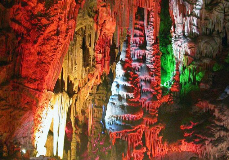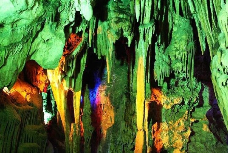進入洞中,人的心情驟然緊張而又企盼著什么,難以名狀。只見在彩燈的折射下,奇石林立,五光十色,令人眼花繚亂,大有美不勝收之感。什么天宮、龍宮、玉免宮……