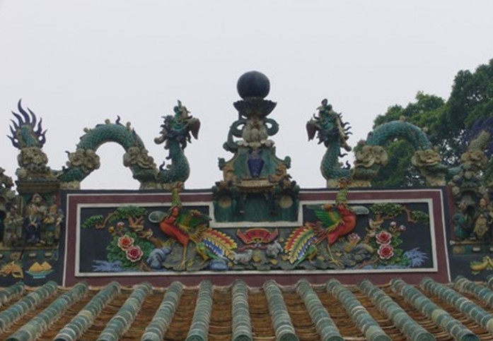 關帝廟位于廣東省鶴山市共和鎮大凹村。原廟已于100多年前圮廢,現存為光緒二十二年(1896)在原址上重建的。1948年修葺過一次。廟由山門、正殿、廂房組成,面積280平方米。營造手法與佛山祖廟相似,正殿屋頂為綠色琉璃瓦,屋脊以陶塑圖像裝飾,屋煞為光緒年間石灣名工燒制之二龍戲珠。