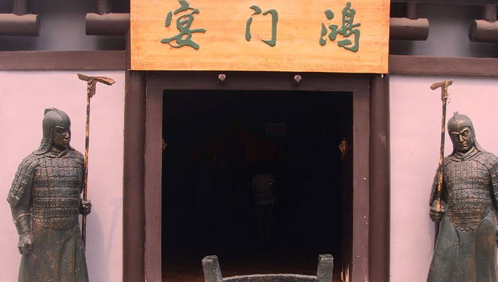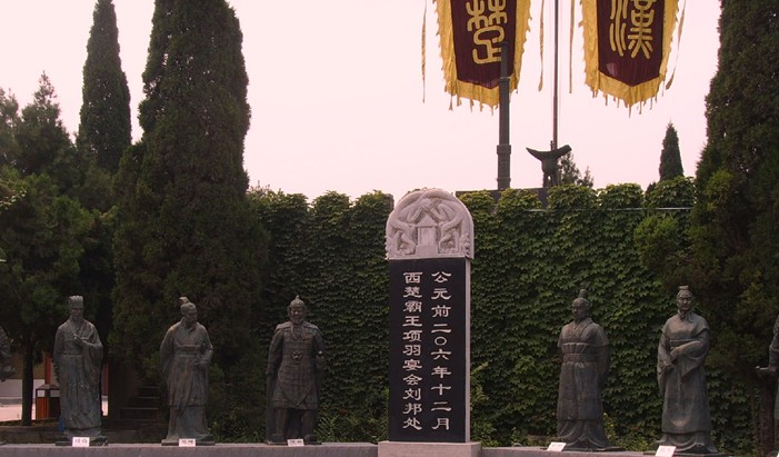 公元207年,項羽從謀士范增之計,在鴻門設宴,企圖借機殺掉劉邦,于是演出了一幕“鴻門宴”,著名的典故“項莊舞劍,意在沛公”就是指這段故事。現(xiàn)存遺址用青磚砌成,十米高的旗桿上飄揚著杏黃色的帥旗,臺子北面建了一座蒙古包似的軍帳,門口高掛“楚高軍旗”,帳內模擬當時的宴會場面,軍帳用玻璃鋼制成,里面塑有“項莊舞劍、樊噲闖帳”等塑像,生動的再現(xiàn)了當年戰(zhàn)事中的重要一幕。