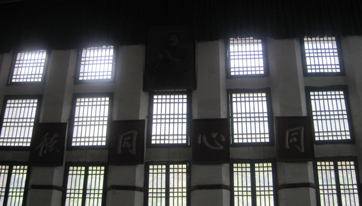 走進中央大禮堂,里面的陳設仍然保持著66年前的風貌。主席臺正中是毛澤東、朱德的巨幅畫像;會場后面墻上,懸掛著“同心同德”4個大字;兩側墻上懸掛4幅“堅持真理”、“修正錯誤”標語;靠墻邊插著24面紅旗,象征著中國共產黨24年奮斗的歷程;插紅旗的“V”字形木座是革命勝利的標志;版權所有山東聊城聊之旅國際旅行社有限公司,轉載必究!在主席臺的正上方,懸掛著一條引人注目的橫幅:“在毛澤東的旗幟下勝利前進!”