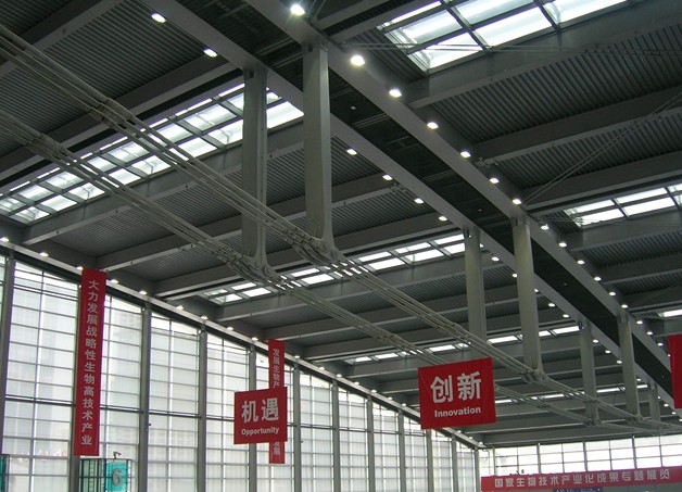 ◆展廳亮度正常照明、事故照明間隔分布,以配合自然采光天窗手動(dòng)調(diào)節(jié);照度為:300lx-400lx(勒克司lx)