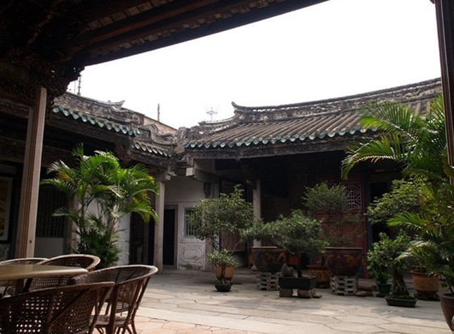 走過門樓,進入前廳,過前進屏門,可見到祠堂中央的天井,天井種有花草,一派春色盎然的景色,另有一番情趣。潮汕建筑的天井,一般不大,講究精巧和儒雅,通常擺有花盆、蓮缸,種上花草,養有金魚,營造一個優雅、恬靜環境。在這種環境的潮人,他們按部就班地斟酌品味工夫茶和從容不迫地彈流水行云般的潮州弦詩,陶冶儒雅的民性,保持著那種講究精致的心理,這里也不例外。
