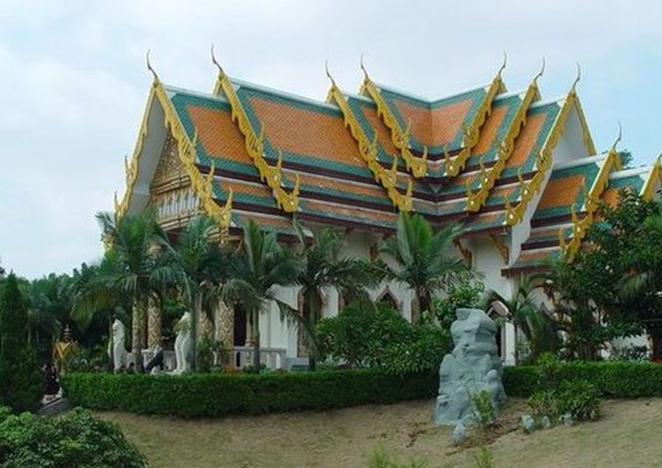 大殿總高19米,建筑面積490平方米。墻為白色,屋角、窗頂尖形,瓦似魚鱗并染青或黃色,屋檐頂端配有一支支向天的黃色裝飾圖案,新穎壯觀。內部布置莊嚴,有精美的壁畫《佛陀的故事》,但沒有中國通常的三如來或西方三圣,僅有一尊泰式跏跌坐式大型銅鑄佛陀圣像,連同蓮座高3米余,重1.5噸,金光閃閃,妙相莊嚴。東殿供奉一尊護法尊者(即四面佛)像。這位護法神,即是大梵天,本是婆羅門教,印度教的創造之神。