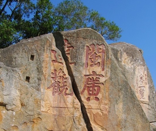 明萬歷五年丁丑季夏(公元1577年)閩粵副總兵晏繼芳題刻的"閩廣達(dá)觀"大字正楷,陰刻、每個(gè)字大一米見方。