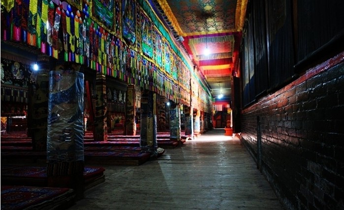 大經堂始建于明萬歷三十四年(1606),毀于火,1917年重建。土木結構,為藏式雙層平頂建筑,漢式樓閣遙相互映。經堂面闊十三間,進深十一間。面積1981平方米。堂內四壁存放著數百冊經卷。