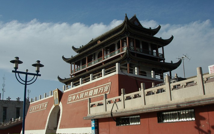 又稱“南門樓”,位于寧夏銀川城東南的南環東路與中山南街交叉口上,坐北朝南,面臨廣場。門樓通高27.5米,下為高7米的長方形券門洞臺基(東西長37米,南北寬28.1米),臺基北面門洞兩側筑有對稱臺階,以便登臨其上。高大臺座上是歇山頂的二層重檐樓閣,高20.5米。