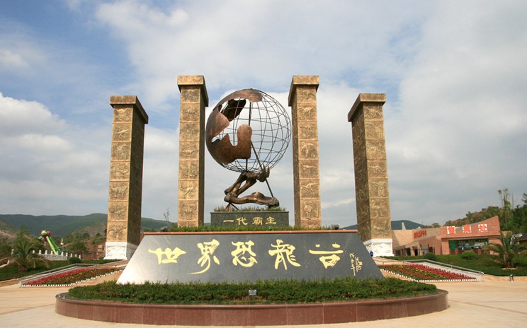 這是世界恐龍谷標志性雕塑——[一代霸主]。黑色大理石基座上一只恐龍前爪化石托起一個侏羅紀時期的地球模型,向我們傳達出恐龍作為中生代地球霸主的王者之氣。