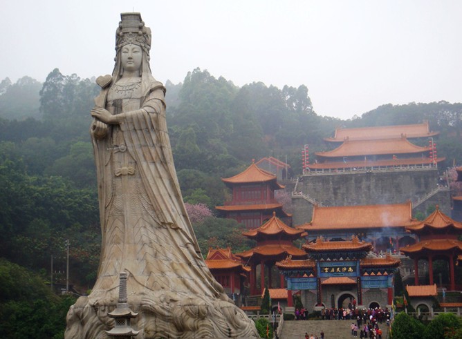 南沙天后宮,緊臨珠江出海口伶仃洋,坐落于大角山東南麓,依山傍水,其建筑依山勢層疊而上,殿宇輝煌,樓閣雄偉,在天后廣場正中就是石雕天后圣像,是為紀念海上女神林默而建,建筑特點是集北京故宮的風格和南京中山陵的氣勢于一體,其規(guī)模是現(xiàn)今世界同類建筑之最,被譽為“天下天后第一宮”,也是東南亞最大的媽祖廟。天后圣像高達14.5 米,屹立在天后宮廣場正中。