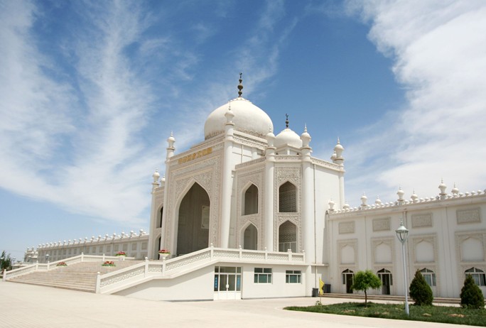 中華回鄉(xiāng)文化園主體大門是借鑒印度泰姬陵設計建造的。她高38米,長206米,即便是站在很遠的地方也能夠看得到她的身影。站在她的面前,她的高大、偉岸、恢宏,給你以視覺的沖擊。走近她,她潔白的身軀、飽滿的穹頂、絢麗的浮雕、繽紛的彩繪、精巧的結構,在藍天白云的映襯下,給你的是心靈的震撼。來到這里,你會被她濃郁的伊斯蘭風格所吸引、所感染、所陶醉;你會明白什么是圣潔的天堂;你還會深深的感受到,來到這里心靈即將經受一次伊斯蘭文化的洗禮。這是建園人的夢想,也是所要達到的目的,更是中華回鄉(xiāng)文化園所要突出的主題。
