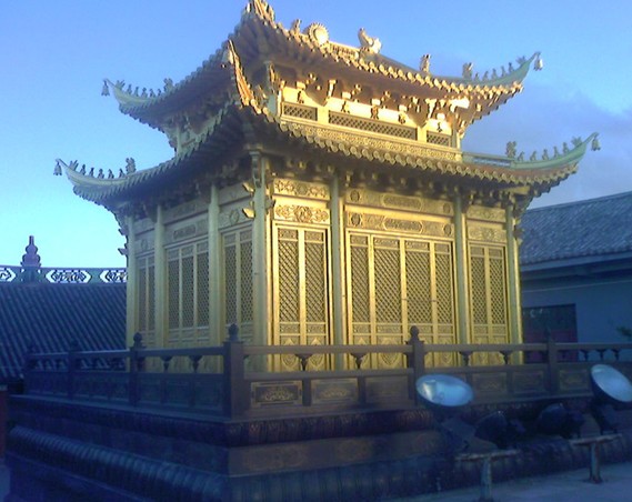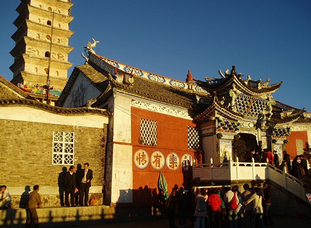 明鑄金殿,在"文革"期間被毀。除了楞嚴塔外,金頂寺保存較為完好的還有"大門"。這道大門是由白族藝人設計的,充分體現了白族精湛的建筑工藝水平。版權所有山東聊城聊之旅國際旅行社有限公司,轉載必究!門頂橫列正脊,兩端垂脊,飛檐翹角,凌空欲飛,形式美觀、大方。進入大門,彌勒殿前供奉彌勒佛像,殿后塑韋陀菩薩像。楞嚴塔后的大雄寶殿里,供奉著釋迦牟尼佛像,佛像兩側,分別塑有阿難尊者、迦葉尊者、達摩祖師、六臂護法王像。