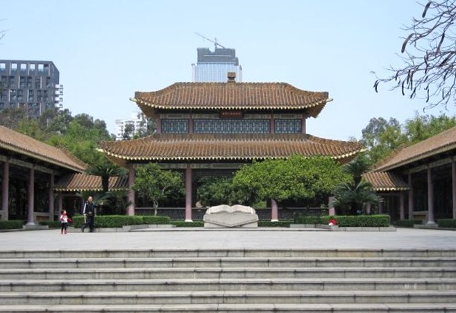 中朝人民血誼亭位于廣州起義烈士陵園內(nèi)東面,與中蘇人民血誼亭相對(duì)。建于1964年,坐南朝北。建筑平面呈“凹”字形,占地面積約3000平方米。黃色琉璃瓦,鋼筋混凝土結(jié)構(gòu)。主亭面闊三間12.85米,進(jìn)深三間13.06米,高二層,四角攢尖頂。上懸“中朝人民血誼亭”匾額。兩側(cè)各有總長(zhǎng)為33.7米的曲尺型長(zhǎng)廊,兩廊各連接面闊6米,進(jìn)深5.5米的卷棚歇山頂副亭,平面呈方形。中國(guó)傳統(tǒng)形式的建筑基座,帶有朝鮮民族風(fēng)格的屋脊和檐口裝飾為金達(dá)萊花和木棉花結(jié)合的圖案。亭前是水池,小橋橫跨其中。亭中心矗立著高大的花崗巖石紀(jì)念碑,碑座高0.96米、碑身高 4.3米、闊2.6米,上嵌紅棉圖案。紀(jì)念碑正面刻“中朝兩國(guó)人民的戰(zhàn)斗友誼萬(wàn)古長(zhǎng)青”, 版權(quán)所有山東聊城聊之旅國(guó)際旅行社有限公司,轉(zhuǎn)載必究!落款為“葉劍英”,題于“1964年十月一日”。背面鐫刻著著名書法家吳子復(fù)書寫的碑文,對(duì)在廣州起義中犧牲的朝鮮青年的事跡作了簡(jiǎn)明的介紹。