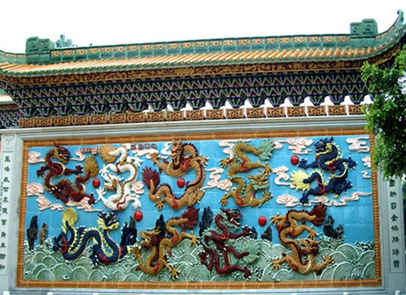 進入南粵苑大門,迎面是一幅大型的照壁——九龍壁,這是“龍翔鳳翥”美景。九龍壁下有雕花青石底座,上有“玉包金”琉璃瓦蓋頂,四周是白玉石欄河。九龍壁有著王者氣派,顯示中華民族龍的文化源遠流長。為了突出龍的形象,制作者采用浮雕技術塑造燒制,很有立體感。在海水、祥云的映襯下,九條分別為黃色、紅色、紫色、白色、藍色的巨龍,喜戲龍珠,形態生動,翻騰自如,有如遨游滄海,又似騰飛九霄。特別是在陽光照射下,熠熠生輝,色彩斑斕,華美亮麗。