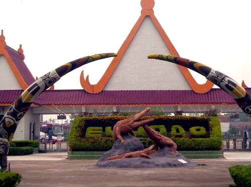 島那金碧輝煌,巍峨壯麗的泰式門樓,門前寬廣的停車場可一次性停放上百輛大巴,進入大門后,有一個十分醒目、高達4米的大型鱷魚雕像——“鱷魚一家”吸收不少游客紛紛在此攝影留念,離雕像百米處,十多個鱷魚池座落在鮮花叢中、綠茵地上、池中養有我們祖先稱為“噴火龍”、“鮫龍”的楊子鱷、泰國灣鱷、馬來鱷、雜交鱷等四個品種.